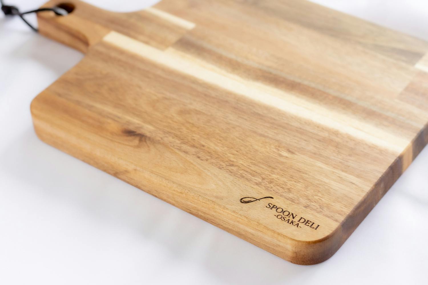 作家が一つひとつ手作りする、アカシアの木で作ったカッティングボードとのセットになります。