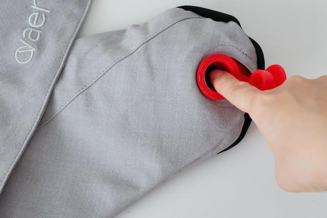 ①ネックピロー左端の伸縮性カバーを外すと、赤い空気バルブが隠れています。ハッチを開け、ひと息吹くだけで、空気枕が膨らみます。