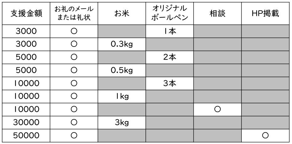リターンをまとめました。お米に関しましては下記の説明をご確認ください。また、相談とHP掲載に関しましては各リターンの内容でご確認願います。