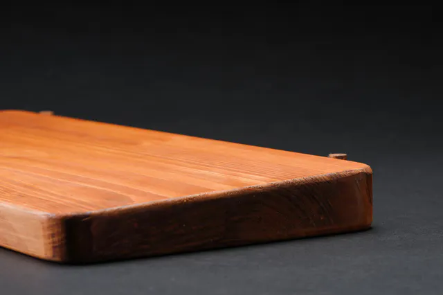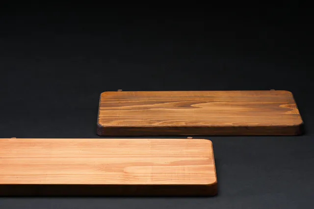 今回のヒバの木は、石川県の能登産の天然木を用いており、2年という歳月をかけてしっかりと時間をかけて乾燥させたものを使っているため、変形等の歪みが現れにくいのが特徴です。さらに、傾斜がついているので、汁物を切る際に流れてくる方向が一方向になり、対応しやすく掃除しやすく、食材が移しやすいです。