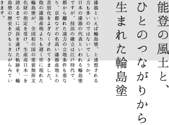 創業200年の輪島塗の製造販売メーカーが、漆器をより身近に感じてほしいと考え、機能的で使い勝手の良い商品開発に取り組み、リーズナブルで利用シーンの多い漆器を提案していきます。