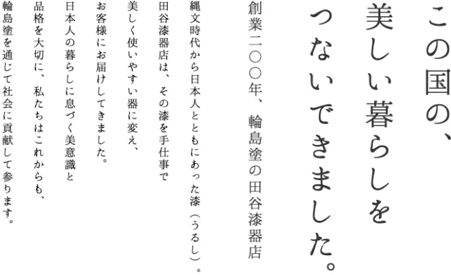1818年創業の輪島塗の製造販売メーカー田谷漆器店。輪島塗の技法を忠実に守りながらも、新しい漆器の可能性を求めて様々なことに挑戦。建築内装への漆塗装や、海外マーケットに向けて現地のライフスタイルにあった商品の展開を行う。日本の一般顧客向けには、飽きのこない伝統的なオーソドックスな商品を作る。現在は、8代目田谷勤、9代目田谷昭宏、10代目田谷昂大の3世代が同時に働いており、その他10名の職人や従業員とともに、輪島の地で輪島塗製作を行う。