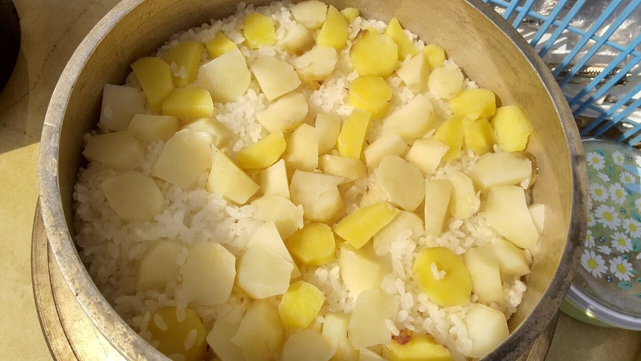 お昼ご飯は焚き火でお味噌汁と羽釜の芋ご飯をつくりました。