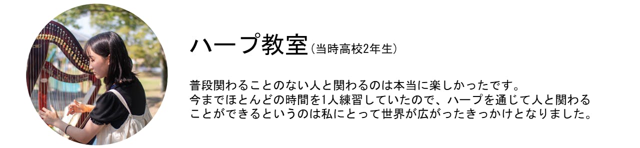高校3年生。パークマーケットプロジェクト実行委員会出店者リーダー。小学2年生からハープを習い始め、ベルギーで開催された第8回フェリックス・ゴドフロア国際コンクールのExcellence部門で第2位などの功績を残す。第1回のパークマーケットでは出店者として参加し、今後は事務局としてもプロジェクトに携わる。