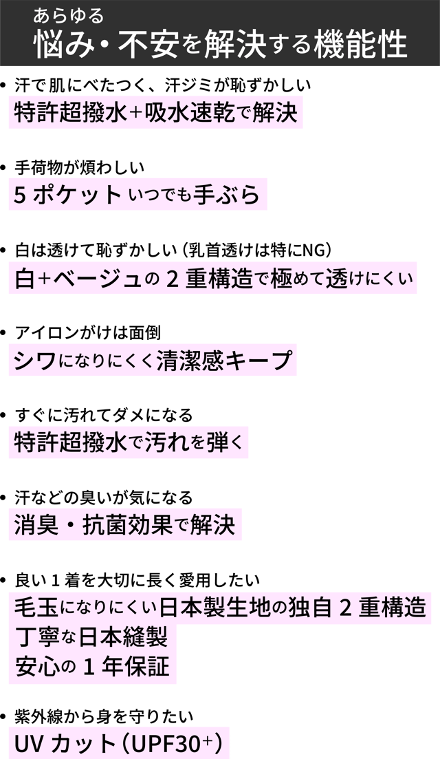 この弱点に関しては、2重構造にするメリット(極めて透けにくい・超撥水&吸水速乾・汗ジミ防止・耐久性向上など)の方が大幅に価値があると判断し、役立つ機能性を一つ一つ丁寧に取捨選択しました。