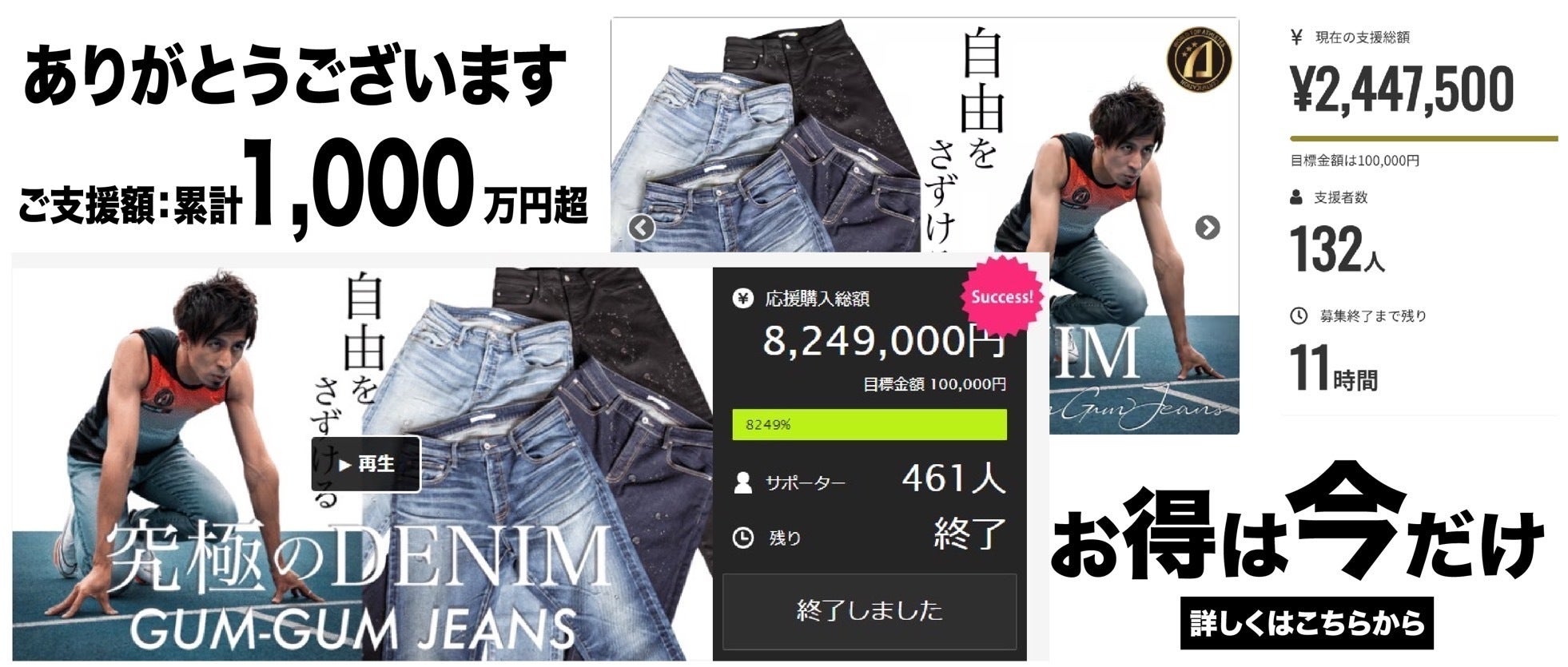 おかげさまで、『GUM-GUM JEANS』 は累計1,000万円以上のご支援をいただくことができました。