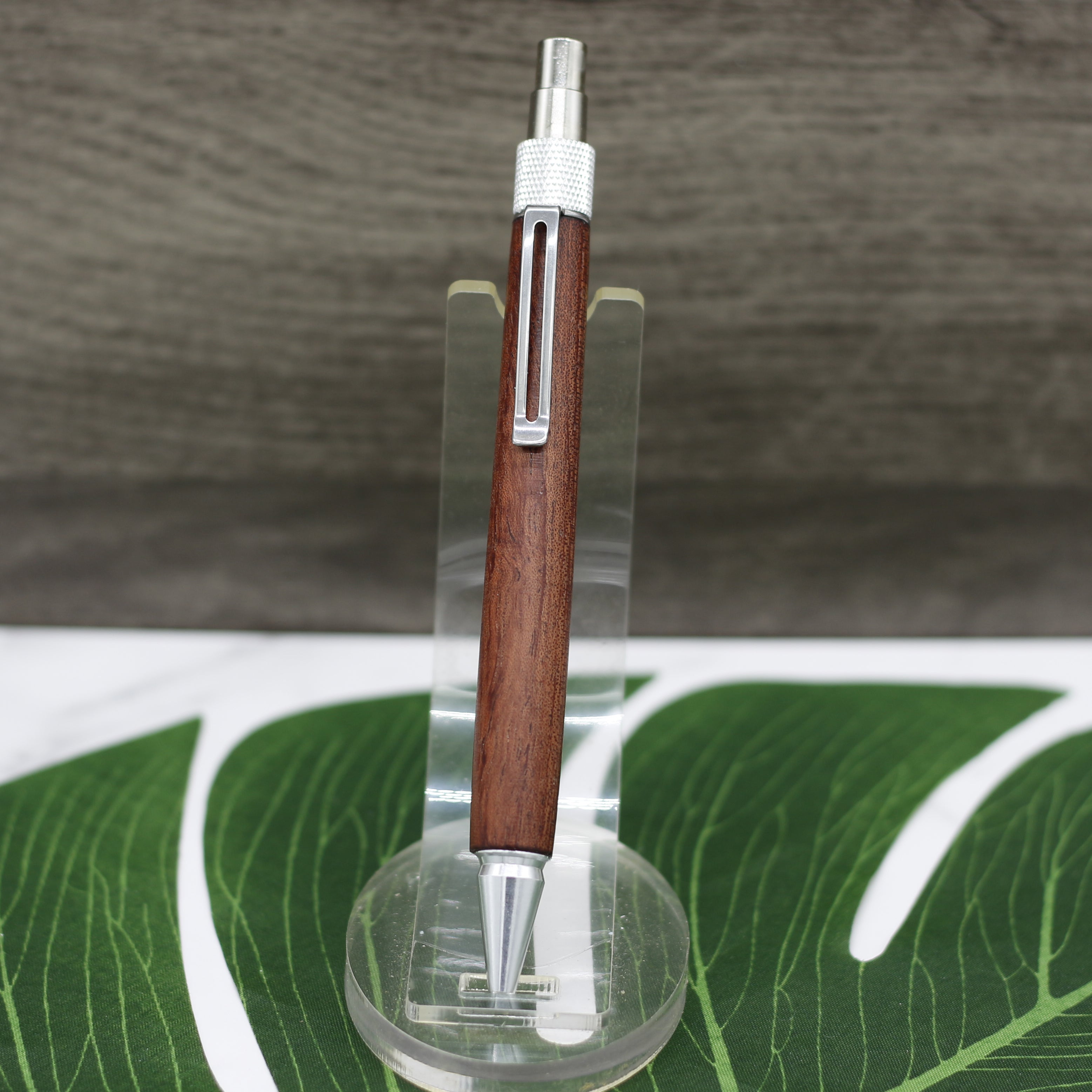 『大人の品格ただよう木軸ペン 第5弾の新アイテム「バディ」をお試しください!』プロジェクトを応援してくださってる皆様!いつも応援ありがとうございます!海外の木材から作られる今回のボールペンは、皆様があまり馴染みのない樹種かもしれませんがもっと日本にも広めていきたいです!今回は、本紫檀の魅力についてお伝えいたします。本紫檀は、アジアのローズウッドとして名高く、数ある木材の中でも最高級に位置づけられます。原木の枯渇により、今非常に輸入が困難な木材の一つです。近い将来確実になくなると思われる材です。樹種「本紫檀 」ミャンマー、カンボジア、ラオス、などの東南アジア及びインドの南部に生育しています。 シタンは非常に硬い木材で木理は交錯し、重硬なため、乾燥および加工性にやや難がありますが、正しい加工をした後は肌触りの良い美しい仕上がりが得られる樹種です。加工中はシタン特有のツンとする香りを感じますが、加工が終わり製品になったものは殆ど匂いは感じません。 主に数珠などの仏具、仏壇、高級箸、お椀、靴べら、唐木細工などの小物の材料として使用されます。 紫檀は内装材や仏壇の材料としては最高級のものとして知られており、そのような用途で使用できるサイズの大きな木材はとても高価ですが、小物の材料となる木切れがホームセンターなどでも販売されている為、そういった意味では割と身近な木材だと言えます。ペンを美しく引き立てる、本紫檀の深み。なめらかな肌触りと重厚な質感、そして落ち着いた色合い。古くから見いだされた本紫檀は、奥深い魅力を持っています。上質な木材の素晴らしさを、机上で身近に味わうことができます。指先からおしゃれ度をアップしてみてはいかがですか?