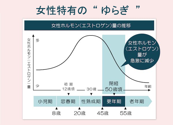 年齢を重ね、 女性ホルモンの分泌が急激に減少することでホルモンのバランスが崩れ、心身ともにさまざまな不調があらわれる人もいます。心体にあらわれる変化に気づき、どこかで気にかけながらも、仕事や家事育児など多忙な日々の中で、自分自身のケアは後回しにしてしまう女性も多いと思います。 女性ホルモンの減少は、30代から徐々に始まると言われ、個人差はありますが、 50代前後の年齢で閉経を迎え、この閉経の時期を挟んだ前後10年間を更年期(ゆらぎ期)といいます。