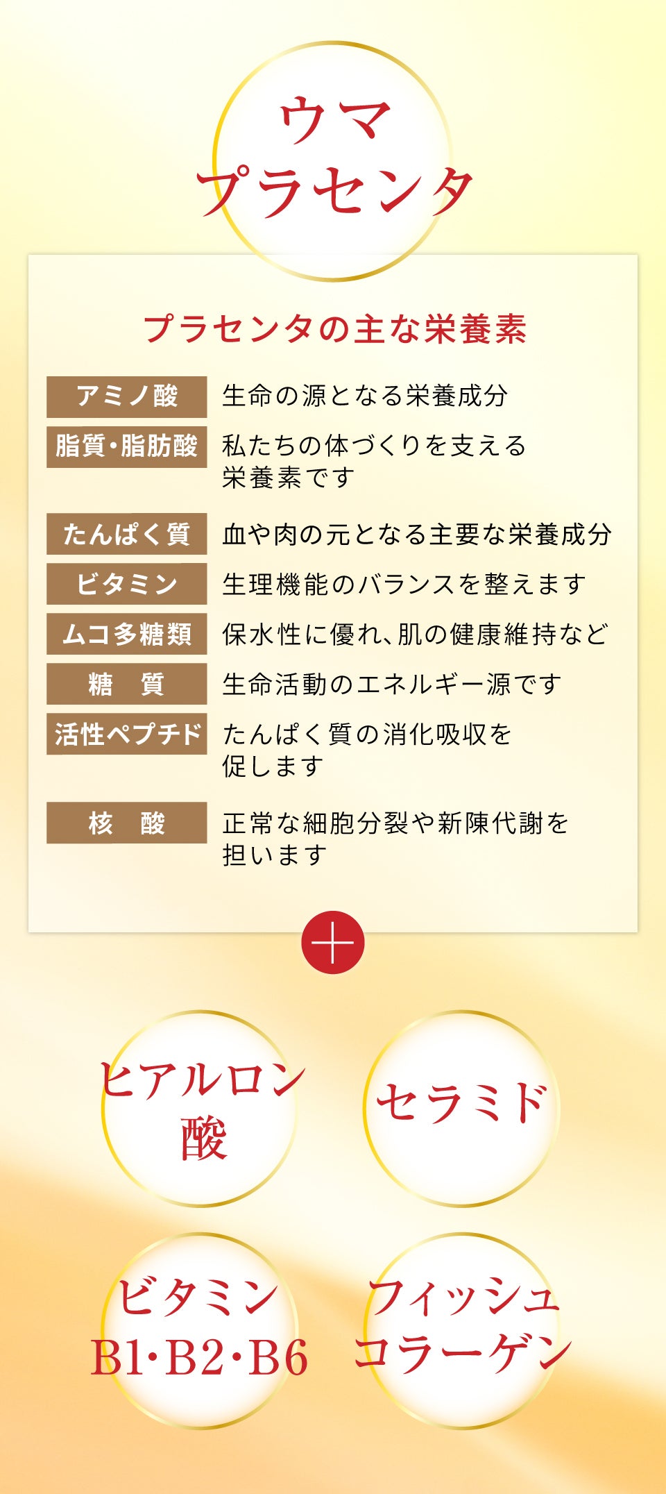 馬プラセンタの主な栄養素に加え、豊富な美容成分も含まれています。