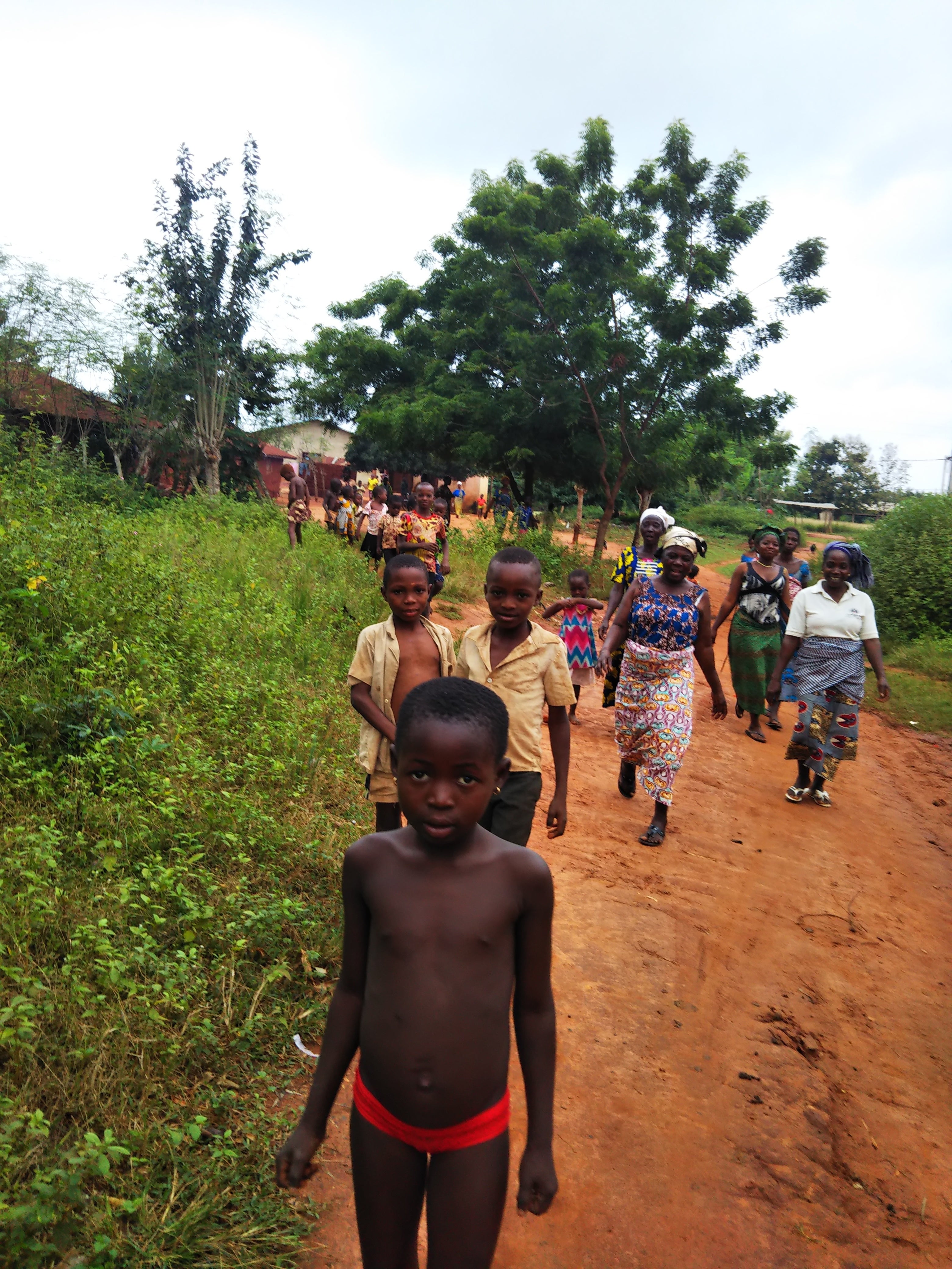(写真:水資源のある隣の集落まで案内してくれた子どもや女性たち。雨季は水たまりができ、移動に時間がかかる)
