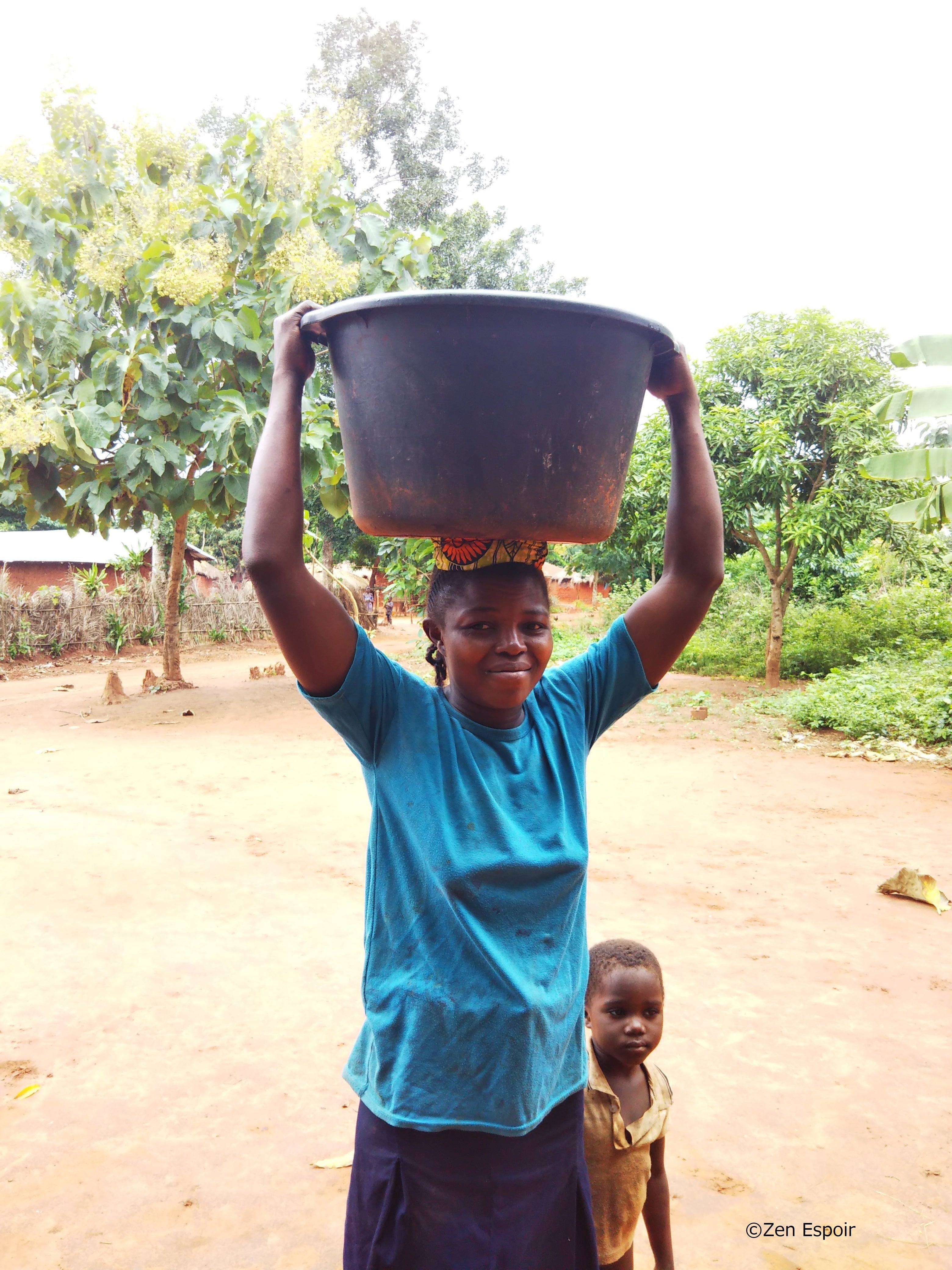 (写真:水を運ぶ女性。このように桶やタンクに水を汲み、頭に載せて運ぶ。ほとんどが女性や子供の仕事)