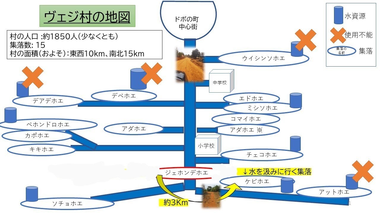 ドボの町の中心街から車で45分ほど離れたところにヴェジ村があります。村の中には15個の集落があり、その中の一つジェホンデホエ集落がプロジェクト実施地です。