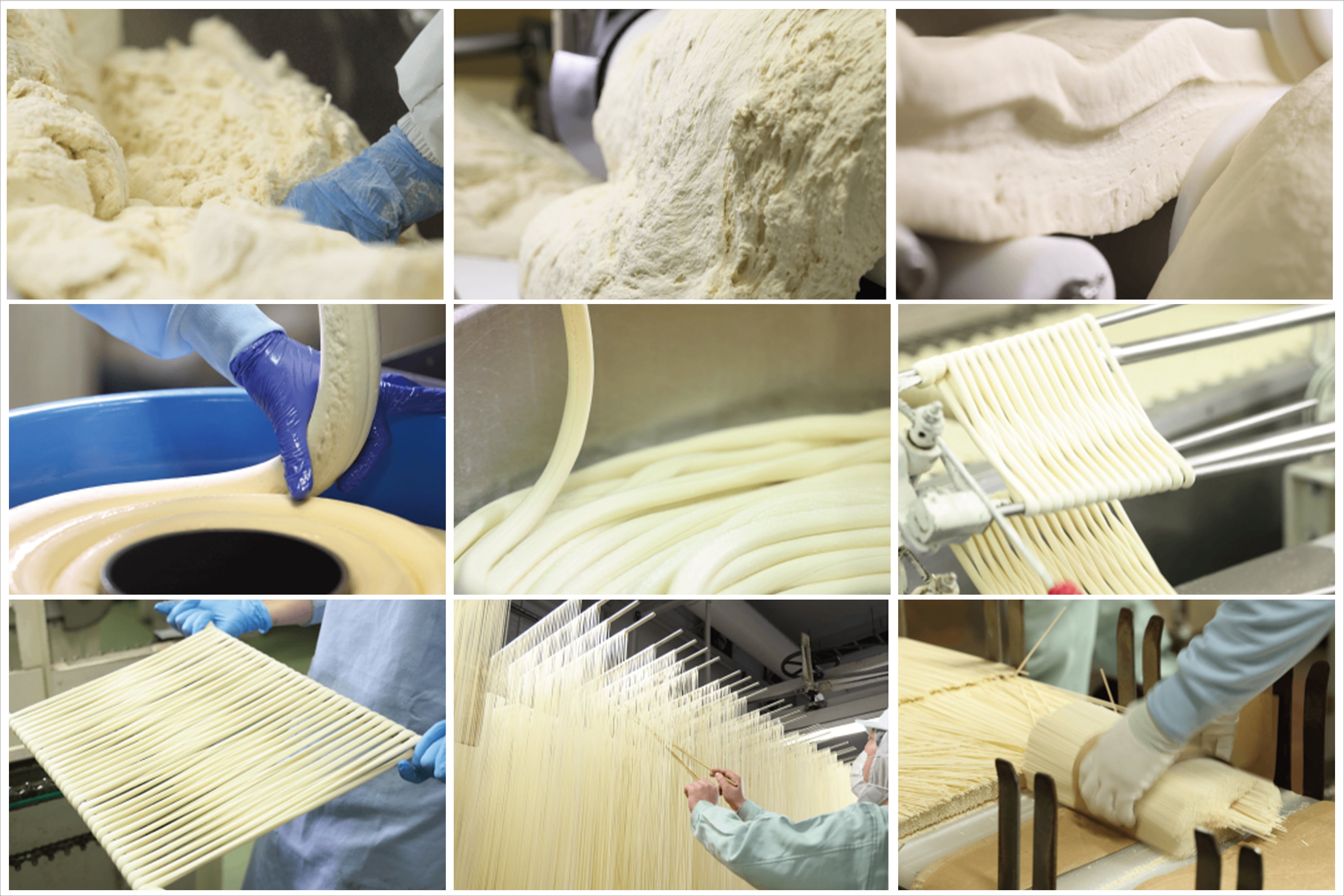 江戸時代より受け継がれる伝統製法である「手延べ製法」は、讃岐の「手打ち製法」とは違い刃物を使わず熟成と延ばしを繰り返しながら麺をひたすら延ばしていき、生地を仕込んでから麺に仕上げるまで、およそ30時間、休む間もない作業を繰り返します。