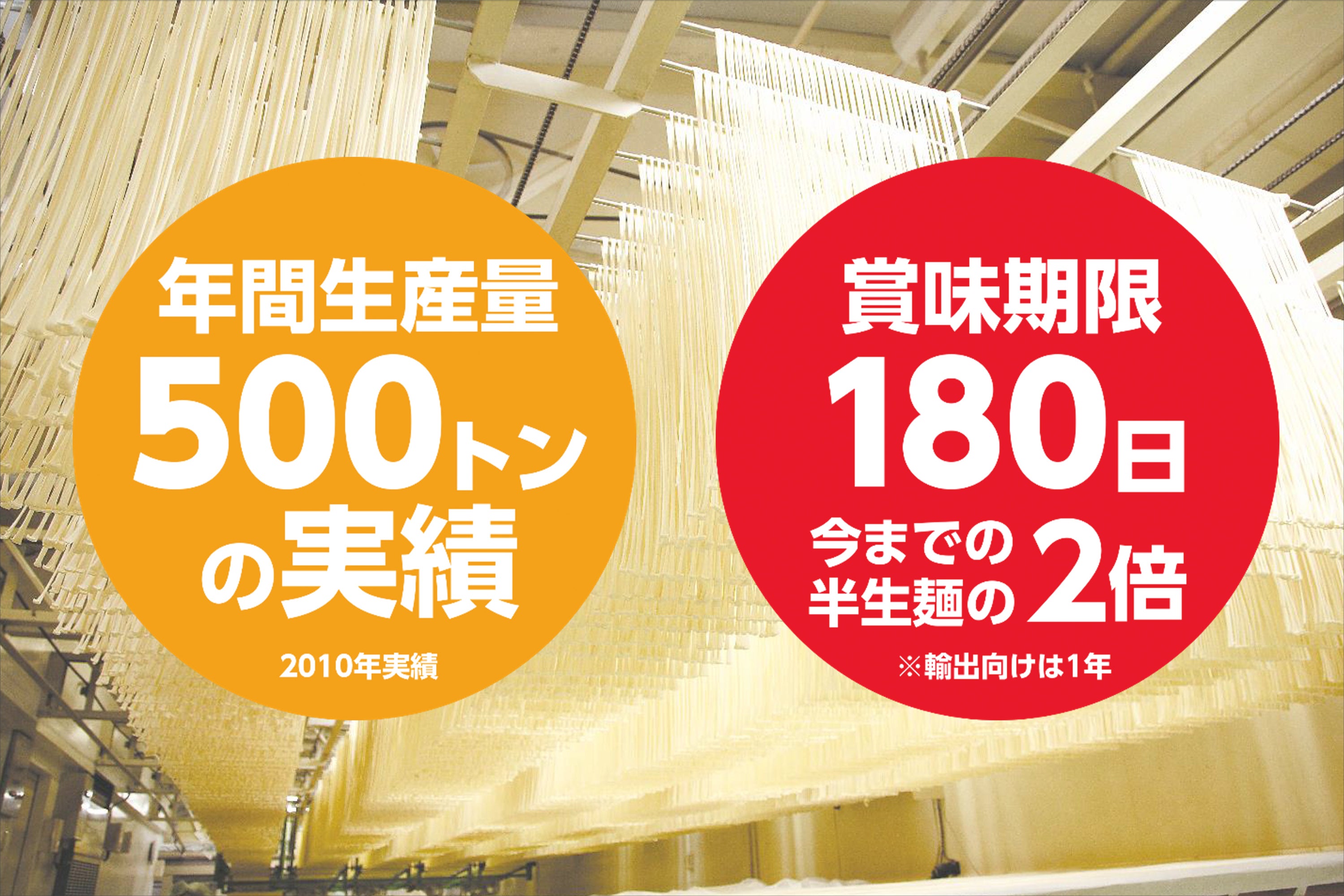 更には今までの半生めんの2倍の長さとなる半年、180日間の賞味期限となっており、