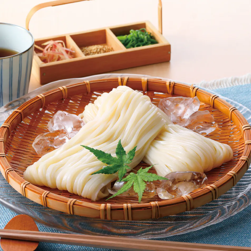 ざる専用の手延べうどんは通常のうどんよりやや細めで、約4分茹での手間いらず。