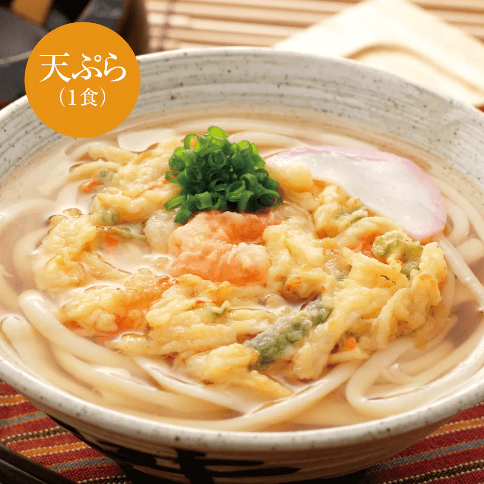 【具材】かき揚げ天ぷら、ねぎ、かまぼこ / 加工でん紛、膨張剤、pH調整剤、調味料(アミノ酸等)、グリシン、着色料(クチナシ、カロチン、コチニール)、(一部にえび・小麦・大豆を含む)