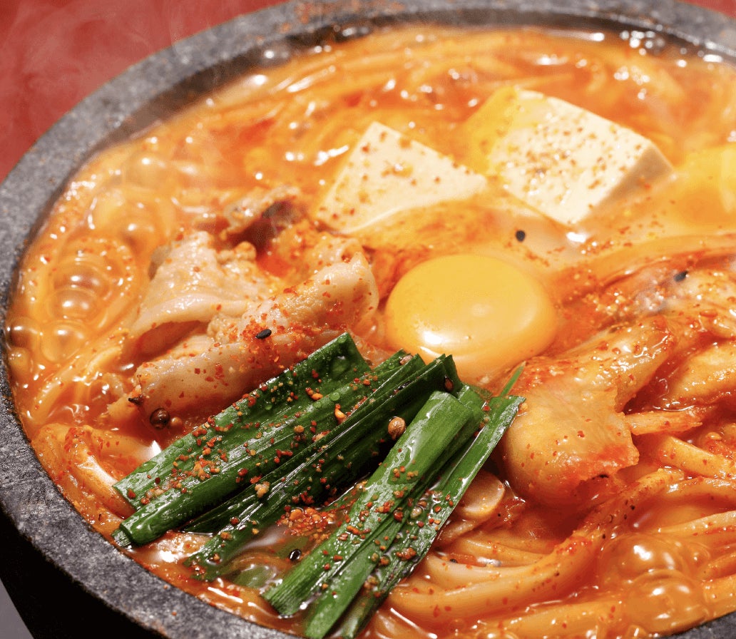 ④③にうどん、豚肉、キムチ、豆腐を加えてさらに煮る。