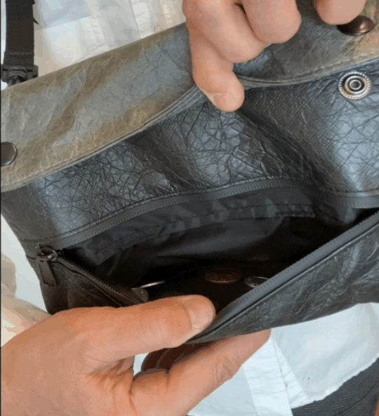 ① のポケットはここにお札と一緒に入れた硬貨が自動で仕分けされて入ることで、かばんを開けなくても硬貨だけ取り出すことができます。もちろん雨の侵入を防ぐ止水ファスナー採用。
