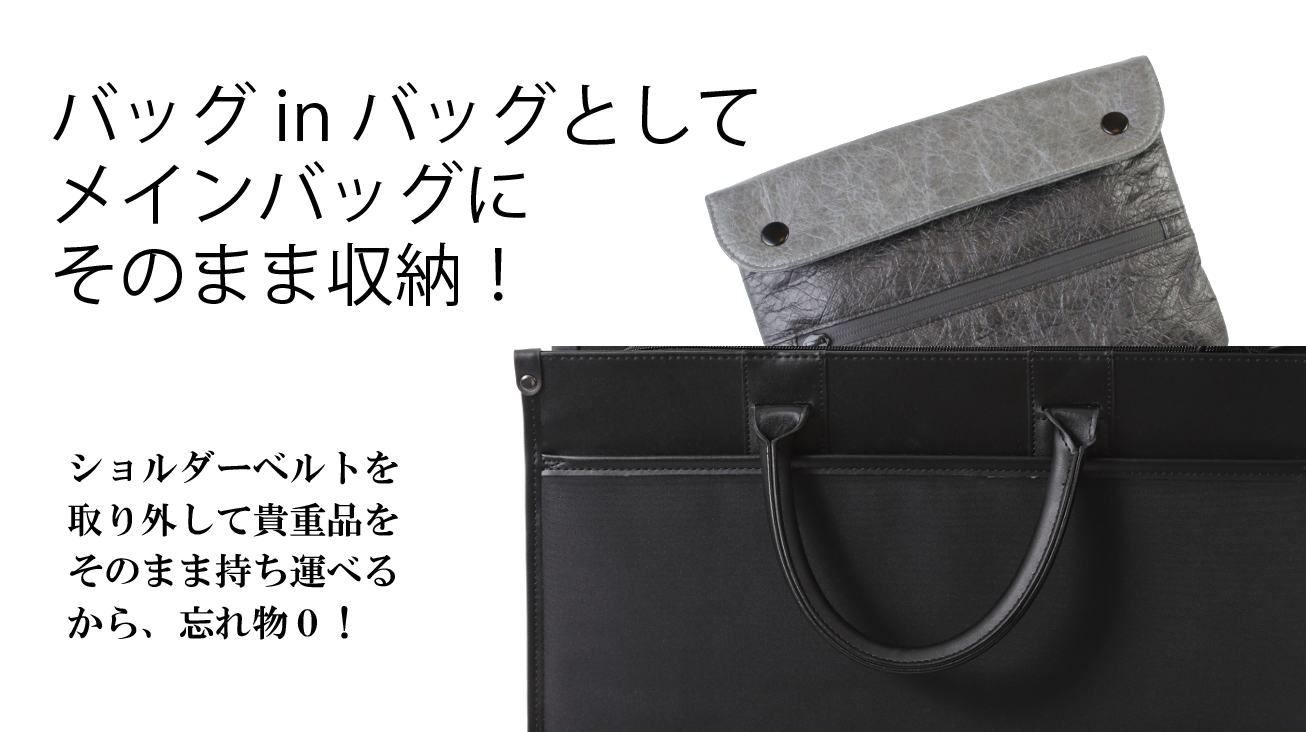 ビジネスバッグの中にそのままバッグINバッグとして。貴重品をそのまま入れて持ち運べるから、休日用のバッグから仕事用のバッグに荷物を入れ替える必要がないから「忘れ物がゼロ」に!!あと、海外旅行のパスポートなどの貴重品を入れるバッグとしても最適。プライベートの旅行にも、出張にも大変重宝します。