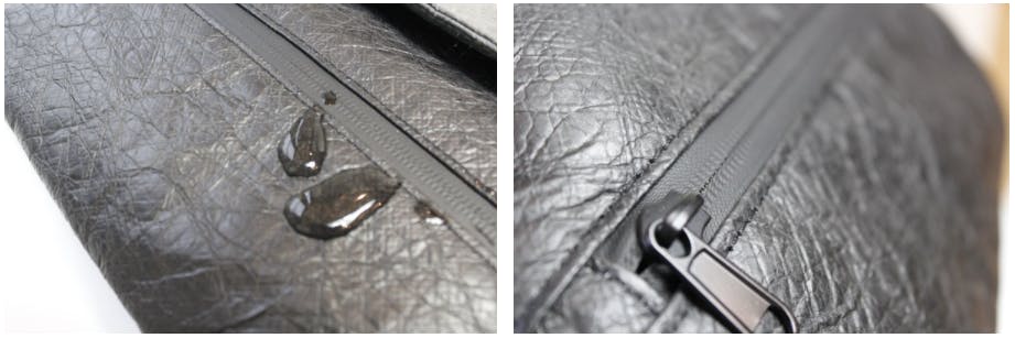 水に強い素材でさらに、外側のポケットは「止水ファスナー」が採用されているため、突然の雨やうかり飲み物をこぼしたりしてもなども弾いてくれます。