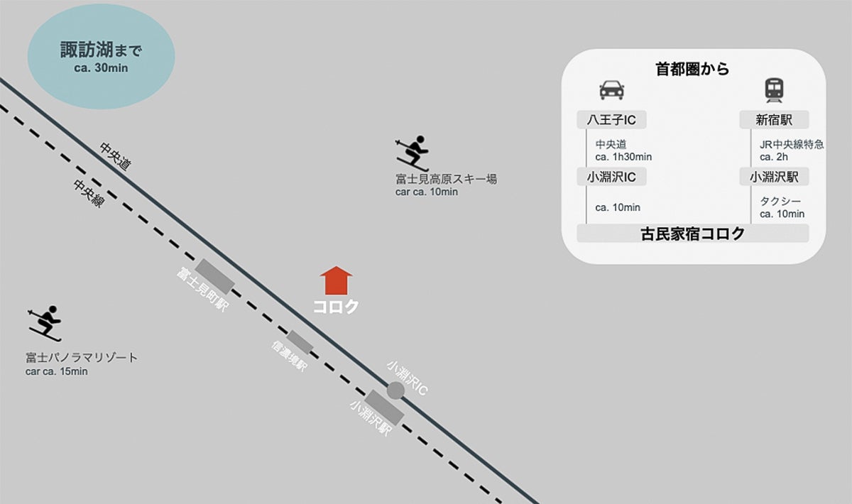 古民家サウナコロクは、山梨県小淵沢と長野県諏訪郡富士見町の県境にある「小六(ころく)」という農村集落に位置しています。