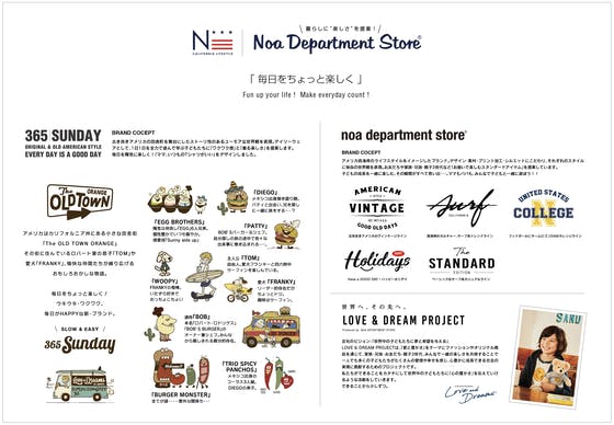 デザイン会社を起業して以来、多くのクライアント様の想いを様々な表現方法でカタチにしていく傍ら、縁あって子供服に携わり、幾つかのブランドを仕入れ販売していましたが、やがて自分たちがデザイン会社として何か未来ある子どもたちにできることはないかを考えるようになりました。私たちのビジョンは「世界中の子どもたちに夢と輝きを与えるリーディングカンパニー」になることです。そのビジョンへの第一歩(架け橋)として、今から4年前に想いを形にしたオリジナルブランド「noa department store」を立ち上げ、10種類のTシャツを製造し販売を始めました。当初、製造・生産においては右も左もわからないままゼロからのスタートで大変苦労しましたが、諦めずにお客さまの声を反映し改善を重ね、幾つかの壁を乗り越え、今年で4シーズン目に入ります。今年は既存ブランドに加え新たにもう1つブランド「365SUNDAY」をリリースする運びとなりました。