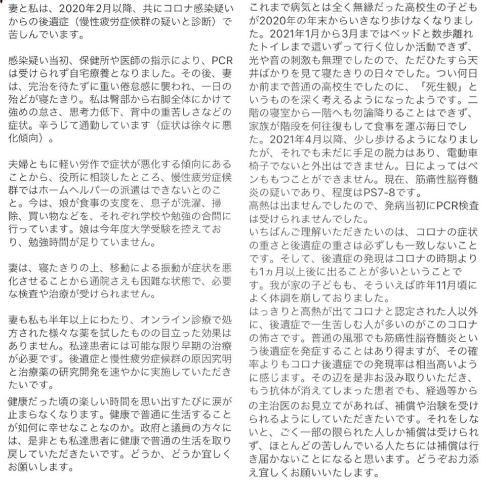 そういった中で、新型コロナウイルスの後遺症および後遺症から発症される方が増えてきている筋痛性脳脊髄炎・慢性疲労症候群の方の支援を感染前よりさせていただいており、昨年は研究を求める請願の署名活動を行い、衆参両院で可決されました。