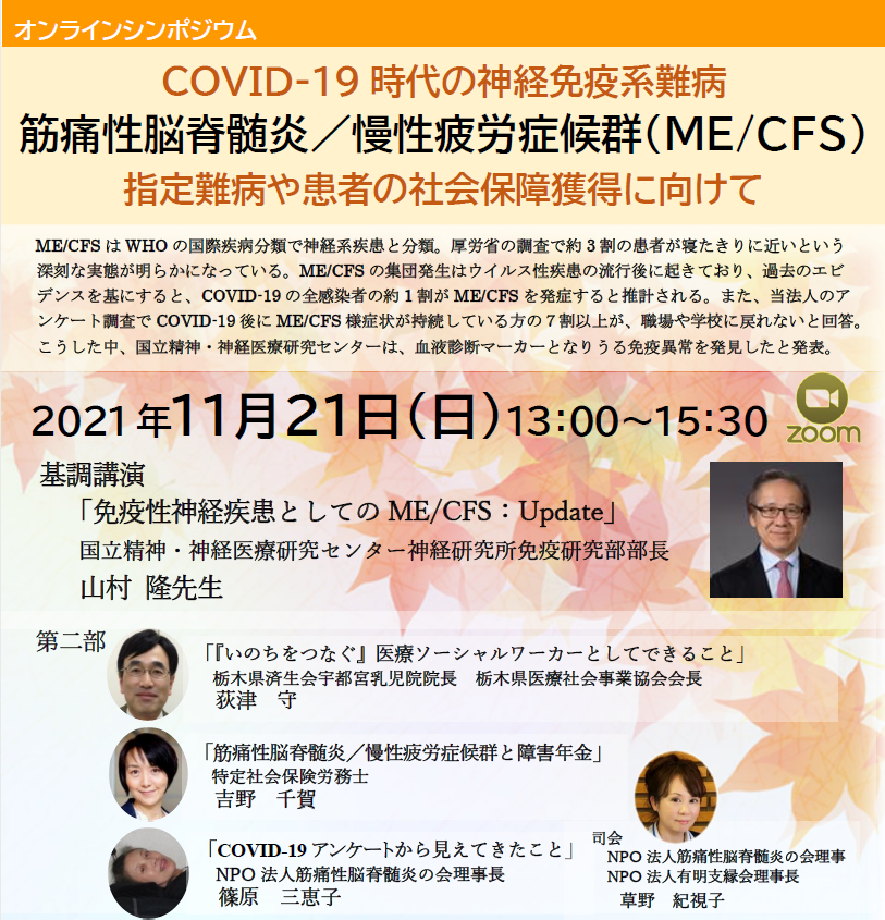 また、難病指定されていないため障害者手帳・障害年金の取得も厳しく、診てくださる医療機関も少ないため、クラッシュ(労作後の極度な疲労)を覚悟のうえで、遠方の専門医に行かれる方も出てまいりました。