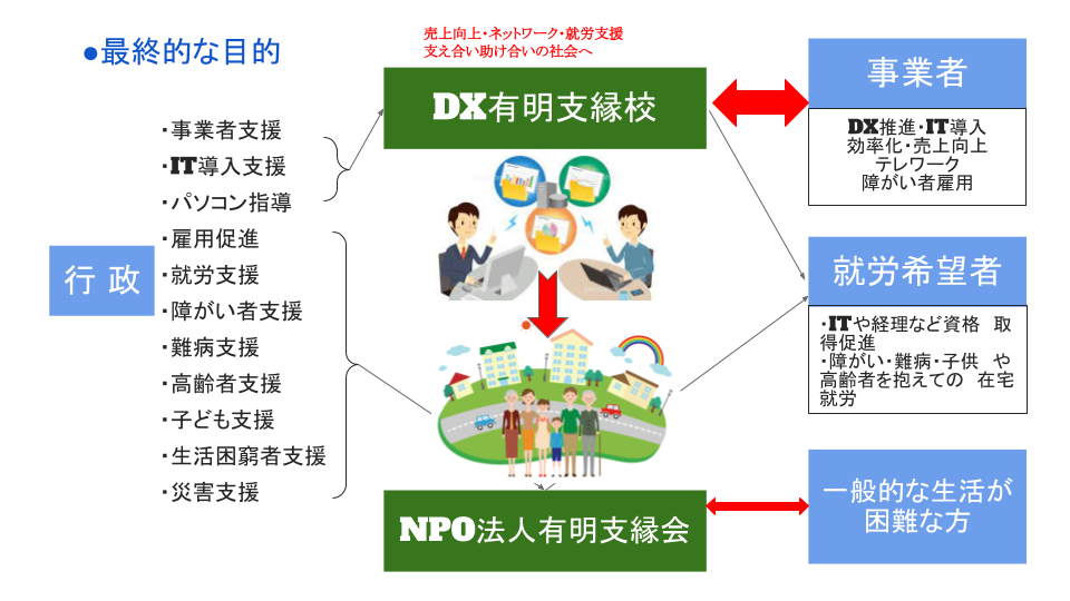 収益事業として「DX有明支縁校」を始めましたが、コロナ禍で売上が落ちてしまった事業者の方などの支援から、普通に生きられない方々の支援へ繋げるため、下記の様な流れで取り組めたらと思っております。