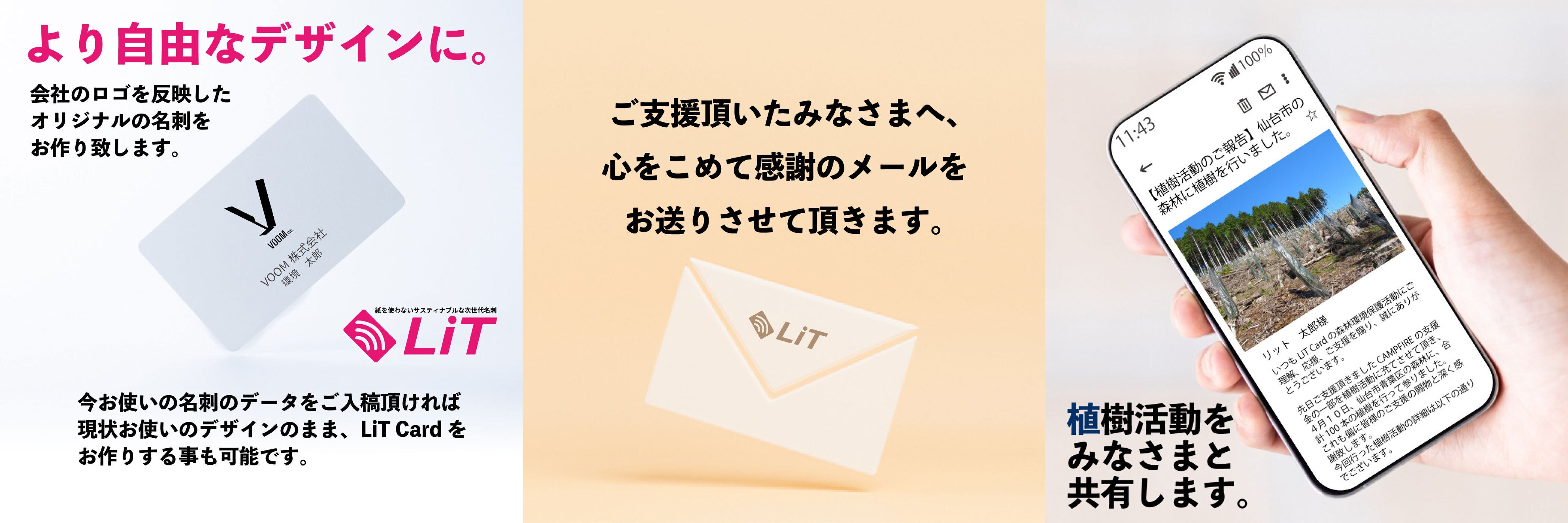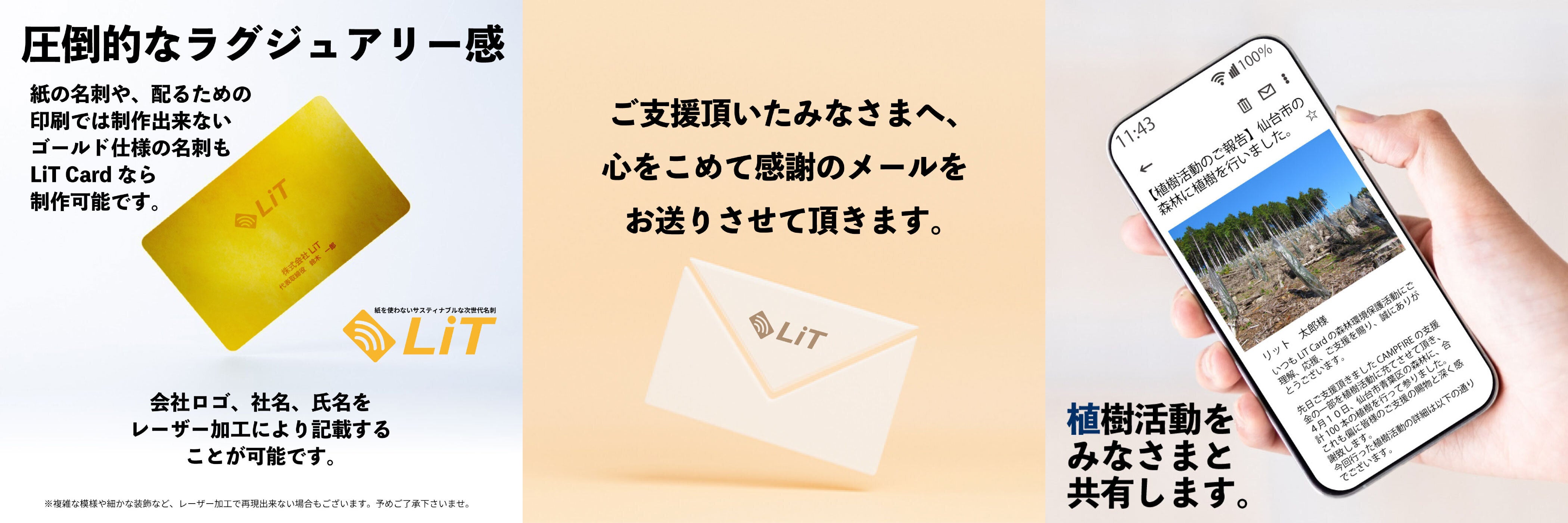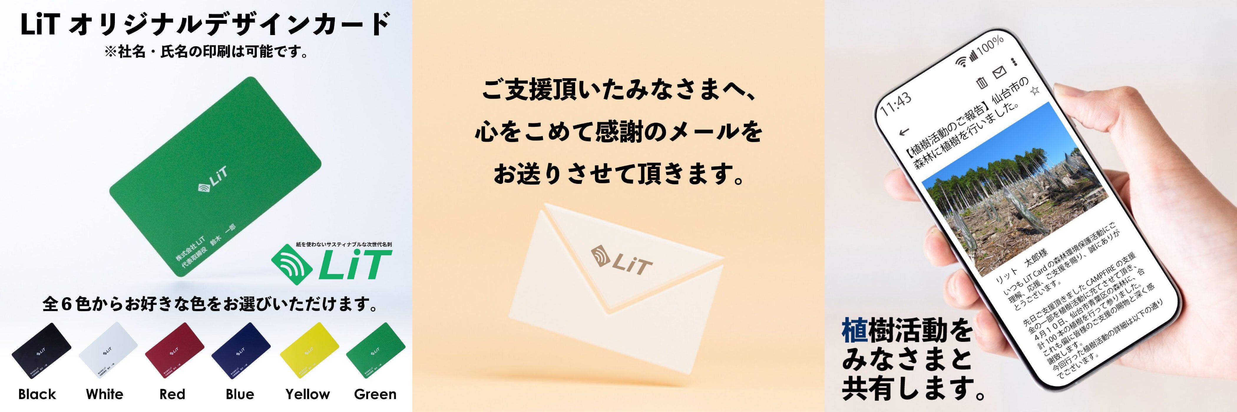 また、当プロジェクトは、ただLiT Cardを普及させるだけでの目的ではなく、皆様からご支援頂いた支援金の一部を、植樹活動にも充てさせて頂き、減っていく森林資源の保護に貢献して参ります。