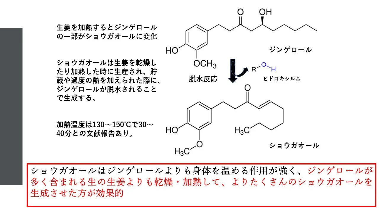 そのショウガオールは100℃を超える加熱水蒸気で加熱することでジンゲロールが変化、豊富に生成されるという研究結果が出ています。