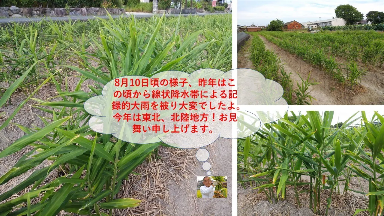 そんな佐賀で、土にこだわり自然の恵みを余すところなく込めて、生姜を作り始め3年目、今年の生姜生育の様子です。今年も一時期冠水し、所々に連作障害も一部発生したものの収穫の秋は迎えられそうです。豊作は来年まで持ち越しですね。