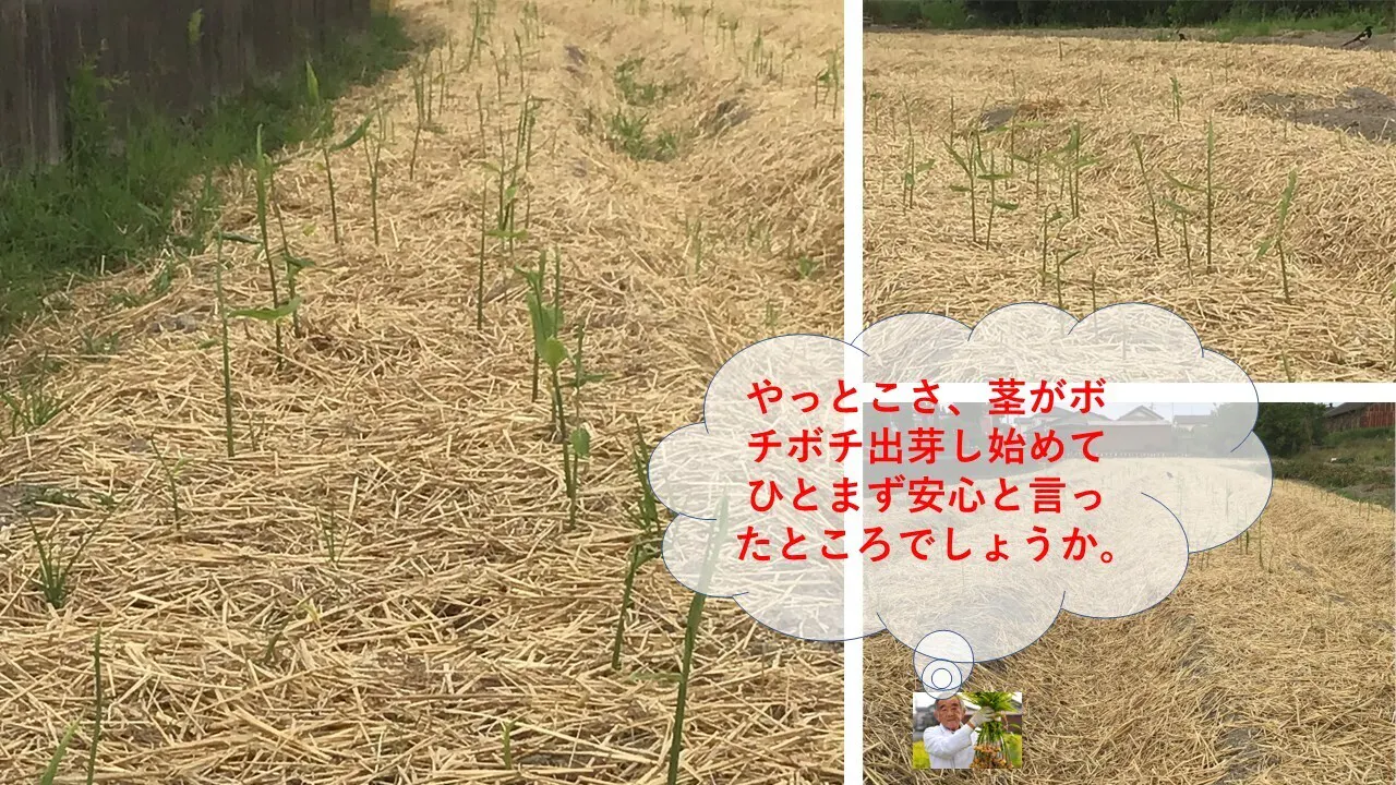 2022年5月下旬頃 麦藁を敷きました。露地栽培はとにかく、次から次に生えてくる雑草との戦いです。除草剤は使いませんから、麦藁を敷いています。種植え付けから約一か月後、やっとこさ、芽が出てきました。