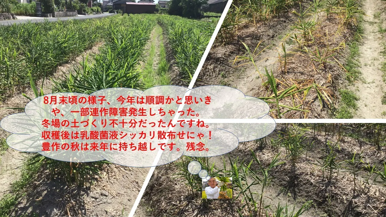 これで、通年で取り組める目途が立ちつつあるものの、今年で3年目の生姜畑の一部に連作障害が発生してしまいました。来期以降これを回避する手立てとして、米糠乳酸菌液の局所散布で乗り切り、サステナブル生姜生業を続けていこうと思案を巡らしているこの頃です。