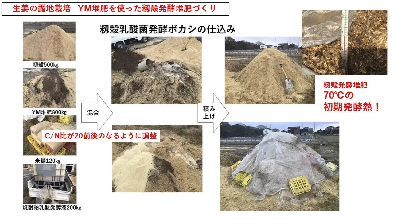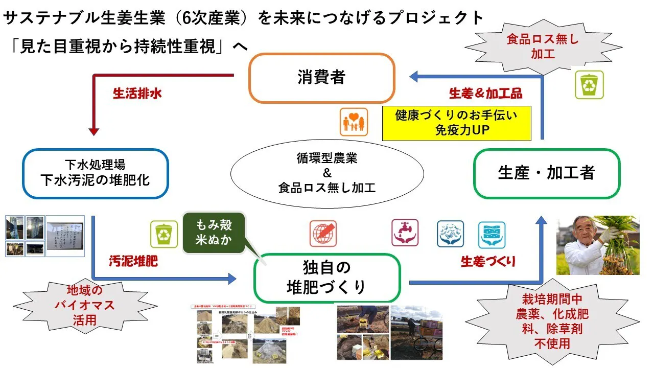 下水道バイオマス由来の堆肥、米ぬか、籾殻を使った独自の発酵堆肥を活用している。訳あり品をも使って、生姜加工品生産の際には、残渣が発生しない食品ロスゼロ工程を確立し多品種の生姜製品を作っている。