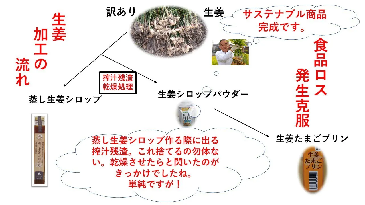 そこで、訳あり品を使って、しかも食品ロスを生じさせず、高付加価値化ができないかと取り組んできた結果として商品化しようと思い立った一つが今回の「蒸し生姜シロップ恋(濃)味」です。これだと、食品ロスを発生させずに全て商品化できます。完璧サステナブル商品の完成です。