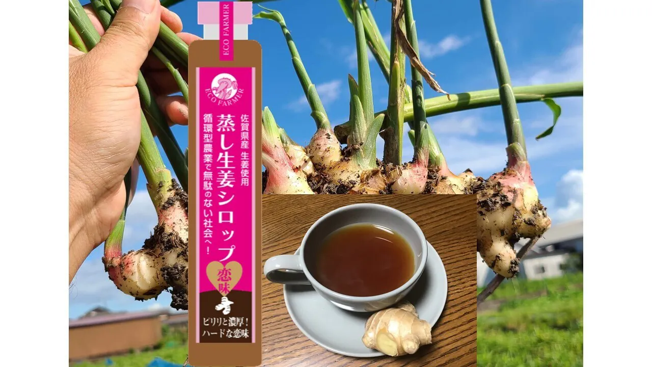 サステナブル「生姜の生業」(栽培×加工×販売 農業の6次化)に取り組むエコファーマーおじさんがつくるポリフェノールたっぷり!の生姜。それを原料にした「蒸し生姜シロップ」(2022佐賀市「いいモノさがし」認定品)と新たに開発した「蒸し生姜シロップ恋(濃)味」を飲み比べてみてください!
