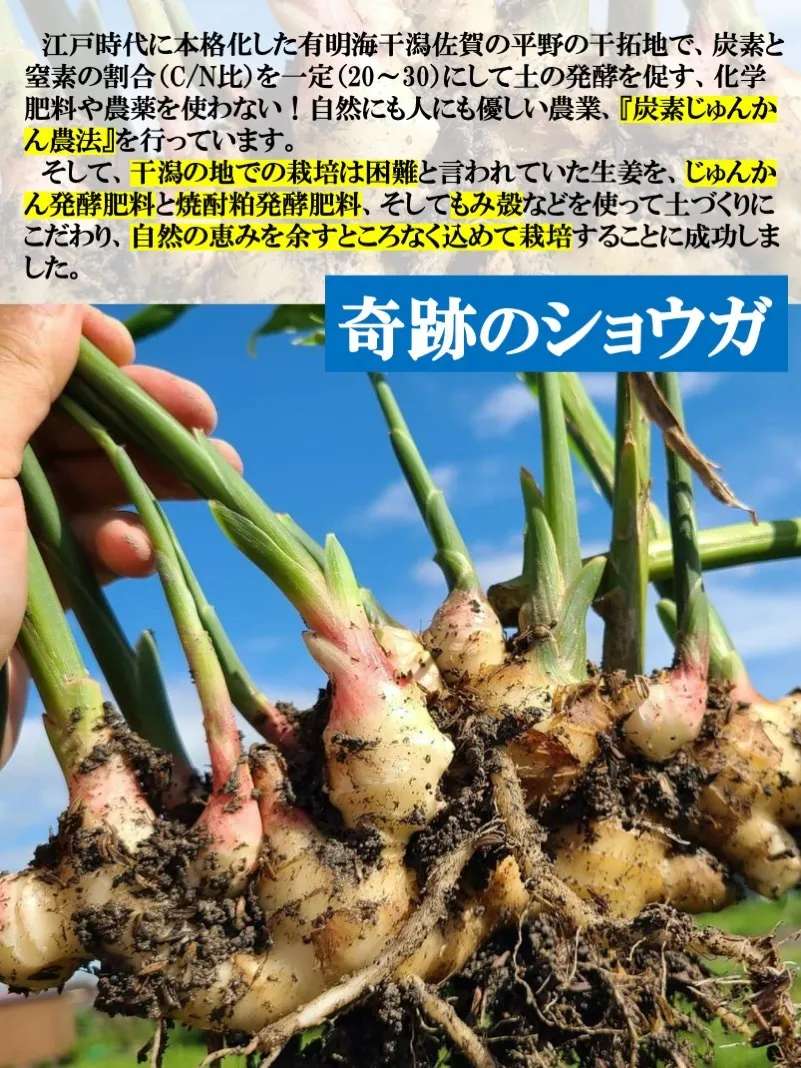 今は一反の小さな農家ですが、これからもガンバル自分を褒めて日々を楽しみ、お日様と豊かな有明の大地に感謝しながら励んでいきたいです。千里の道も一歩から、一人息子が脱サラして就農しようかなぁと、そして、孫もやってみようと思ってくれるよう、御年66歳の新米エコファーマーおじさん、「見た目重視から持続性重視」へと、サステナブル生姜生業の未来に向けて、一層、自分のココロや畑を耕していきます。皆様、たくさんの応援、心からよろしくお願いします。