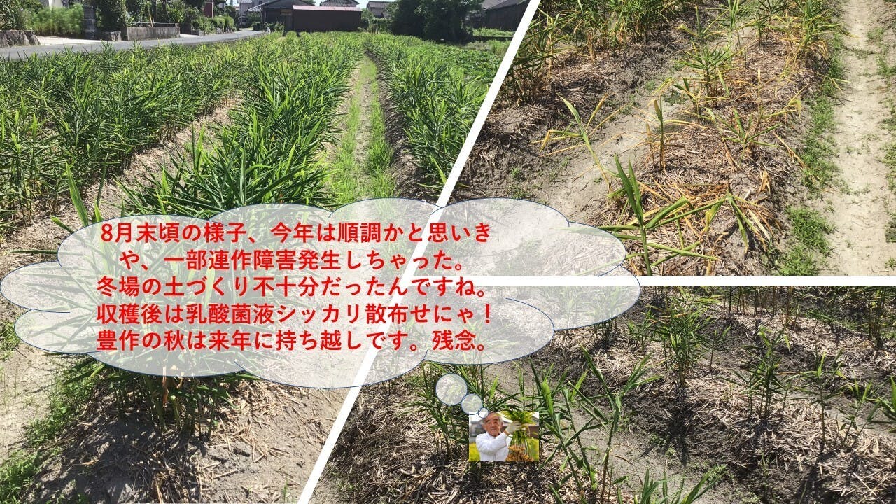 これで、通年で取り組める目途が立ちつつあるものの、今年で3年目の生姜畑の一部に連作障害が発生してしまいました。来期以降これを回避する手立てとして、米糠乳酸菌液の局所散布で乗り切り、サステナブル生姜生業を続けていこうと思案を巡らしているこの頃です。