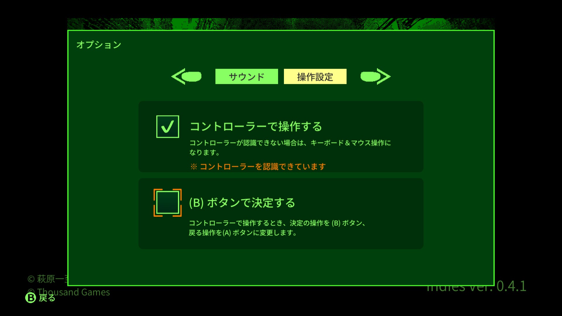 【オプション】の実装と操作設定の方針についてオプションの実装を進めております。まずは必要最小限ということで、サウンド(BGMとSEの調整)と操作設定(コントローラー)のみ実装することに致します。リクエストがございました、コントローラーの【決定】ボタン入れ替えもようやく実装されました。「もう慣れちゃったよ!」という声も聞こえてきそうですが…… 。ごめんなさい。それから操作設定に関してですが「マウスのみでの操作」「キーボードのみの操作」は、工数がかかることが見込まれるため、見送ることに致しました。 「コントローラーのみでの操作 」「キーボード+マウスでの操作」を、より快適にする方針でアップデートを行います。バトル開始のキーボードショートカット(Bキー)なども対応予定です。※画面は開発中のもので、一部の変更が予定されています。