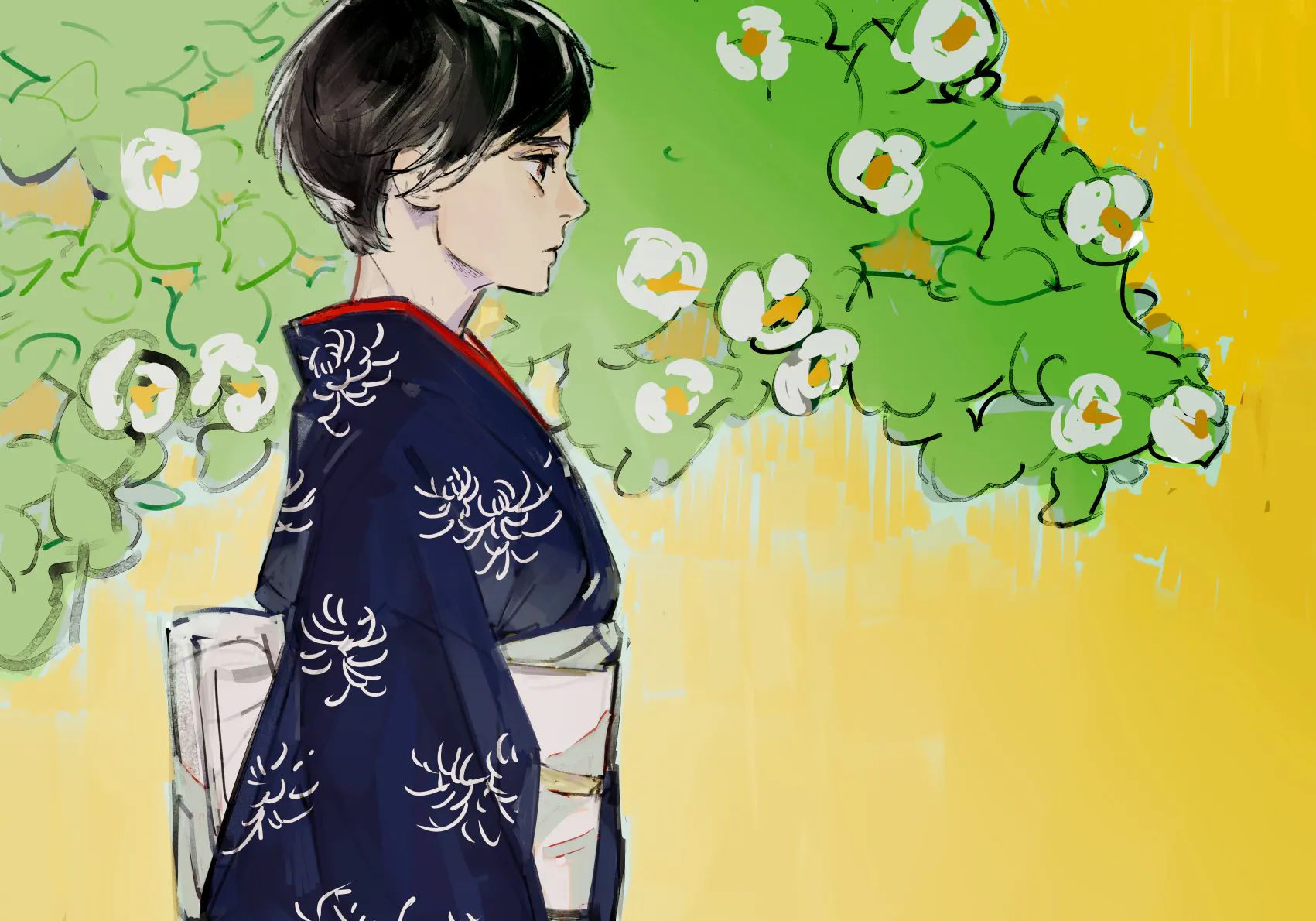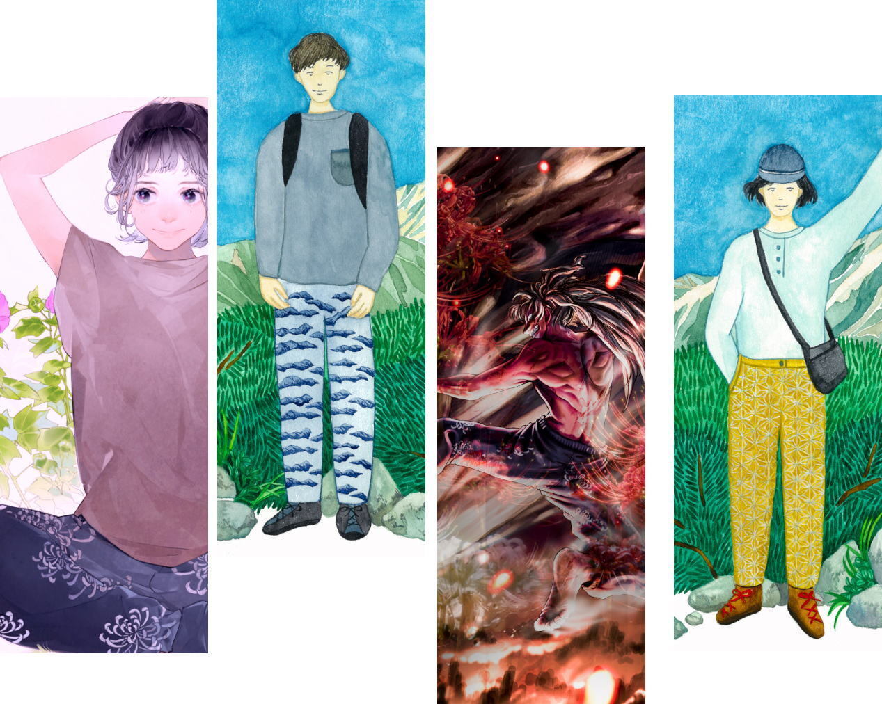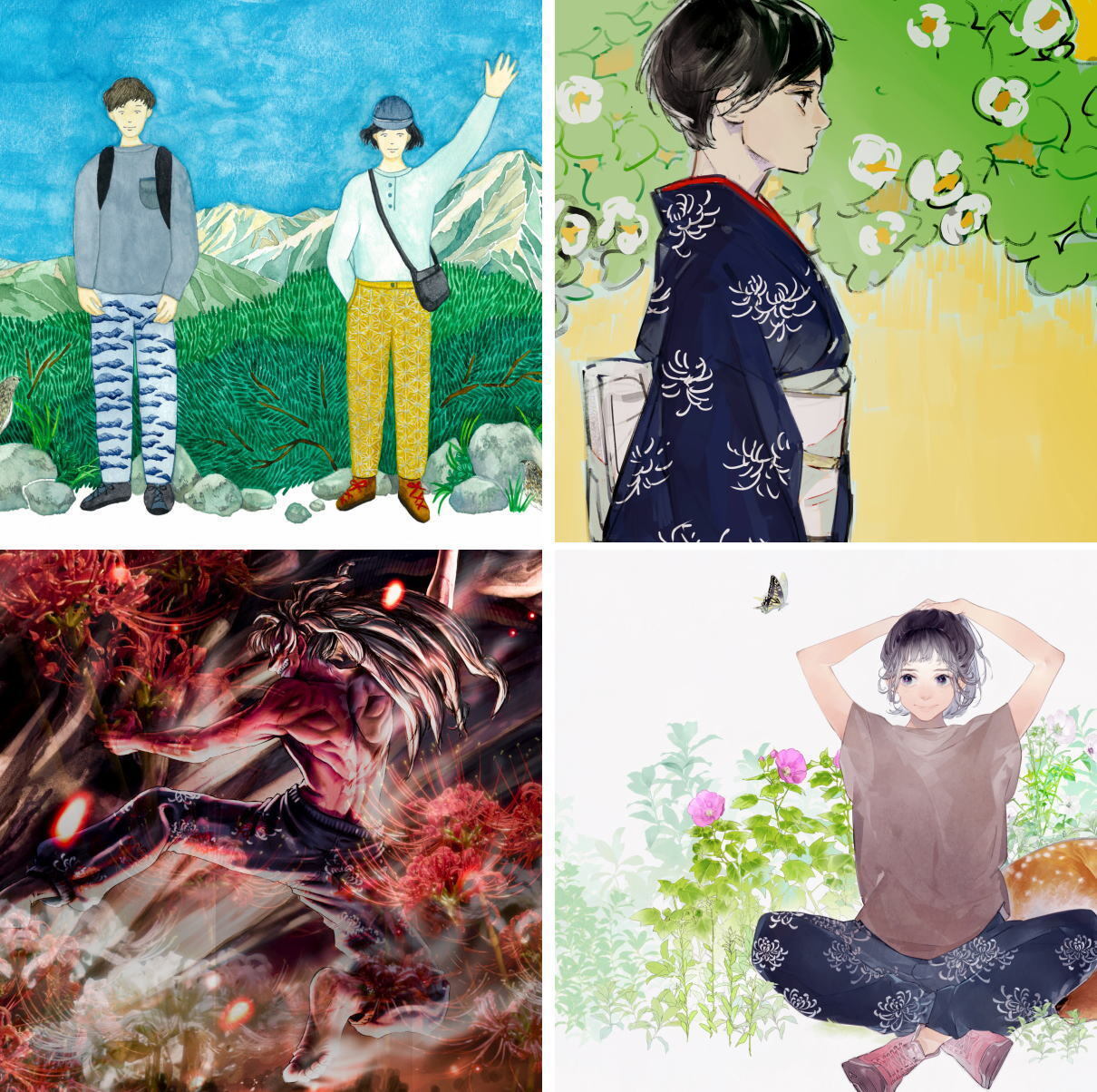 彼岸花/菊:着物に用いられる伝統的な柄で、イラストのようにトップスに無地を合わせるとはまる綺麗で艶やかなデザインです
