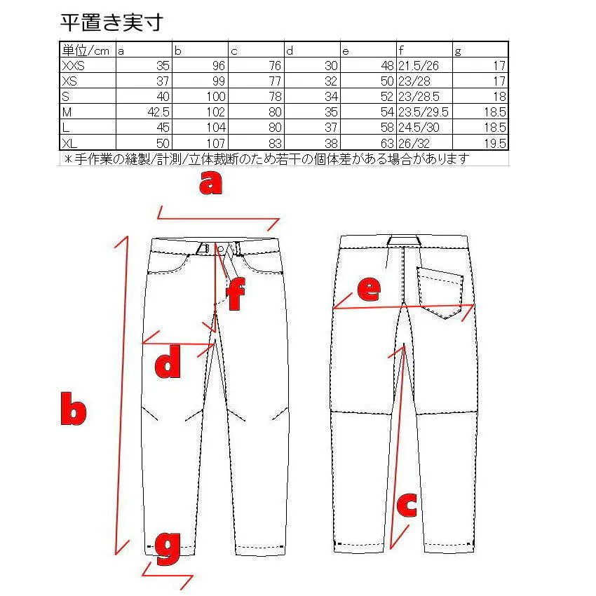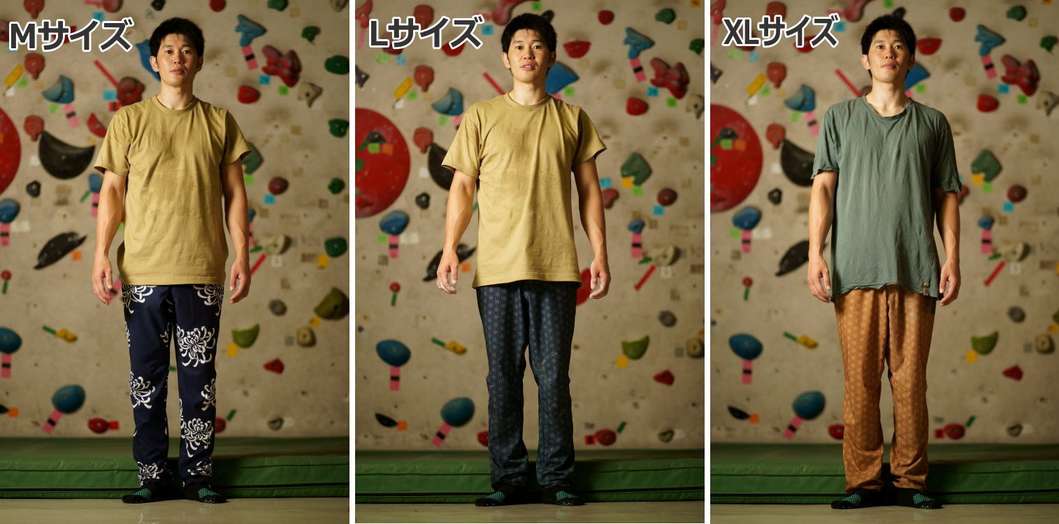 *Mでウエストジャスト足回りちょいゆるめ、Lでウエストゆるめ足回りゆるめ、XLで太め