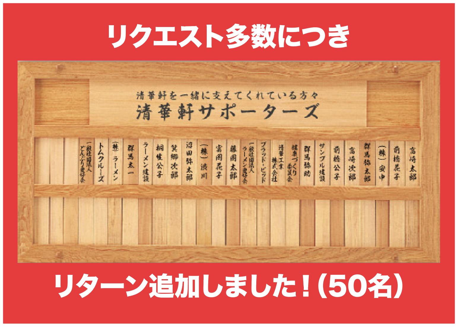 直接またSNSのメッセージ等で、「木札増やせませんか?」というお声をたくさん頂いたので、50名様分の応援木札のリターンを追加させて頂く事にしました。