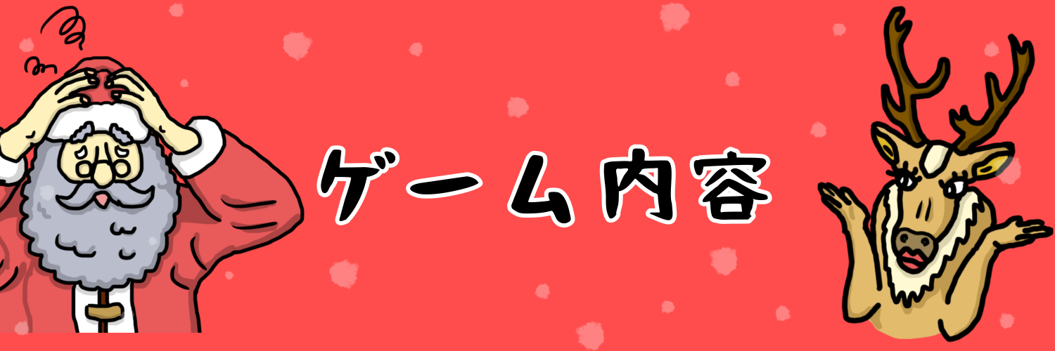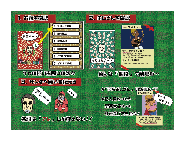 1人が親(おじさん)、残りが子(サンタ)となり、おじさんは『欲望カード』に書かれたお題を言葉とジェスチャーで制限時間内にサンタへ伝えます。
