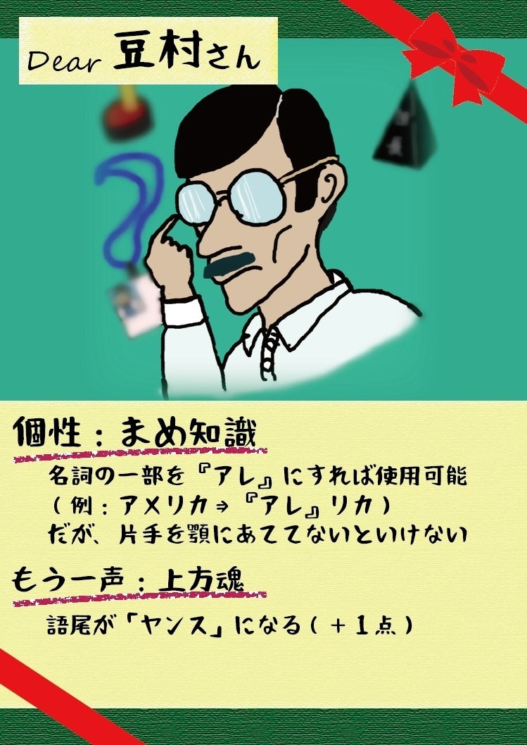 『おじさんカード』には『長所』と『短所』『個性』*があり、それに従う必要があります。これによりゲームごとに違ったヘンテコな展開が楽しめます。
