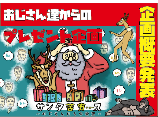 クラウドファンディング終了まで残り2週間ほどとなってまいりました!この度は『サンタ苦労ス~おじさん達の欲望~』の遊び方のイメージを少しでも伝えるべく、プロモーション企画を行うことを決定しました!その名も『ソレ』してくれたら『アレ』あげちゃう企画!詳細と問題はYoutubeへ!https://www.youtube.com/channel/UCa_G0I8plmHuBHUGpyL6USw<企画概要>ゲームルールに従い、『おじさん』になりきってお題を皆様に3問出題する企画です。ご参加いただいた方から抽選で1名様にプレゼントをお渡しします!<賞品>ボードゲーム『サンタ苦労ス~おじさん達の欲望~』×1※既にご支援済の方が当選の場合はAmazonギフト券2000円分と選択可能です(ご支援状況が分かるスクリーンショット等のご準備をお願いします)この企画を通してこのボードゲームの雰囲気が少しでも伝われば幸いです!製品が納品されましたらその様子も配信してまいりますので是非Youtubeチャンネル登録もよろしくお願い致します(*^-^*)引き続き『サンタ苦労ス~おじさん達の欲望~』をよろしくお願い致します。