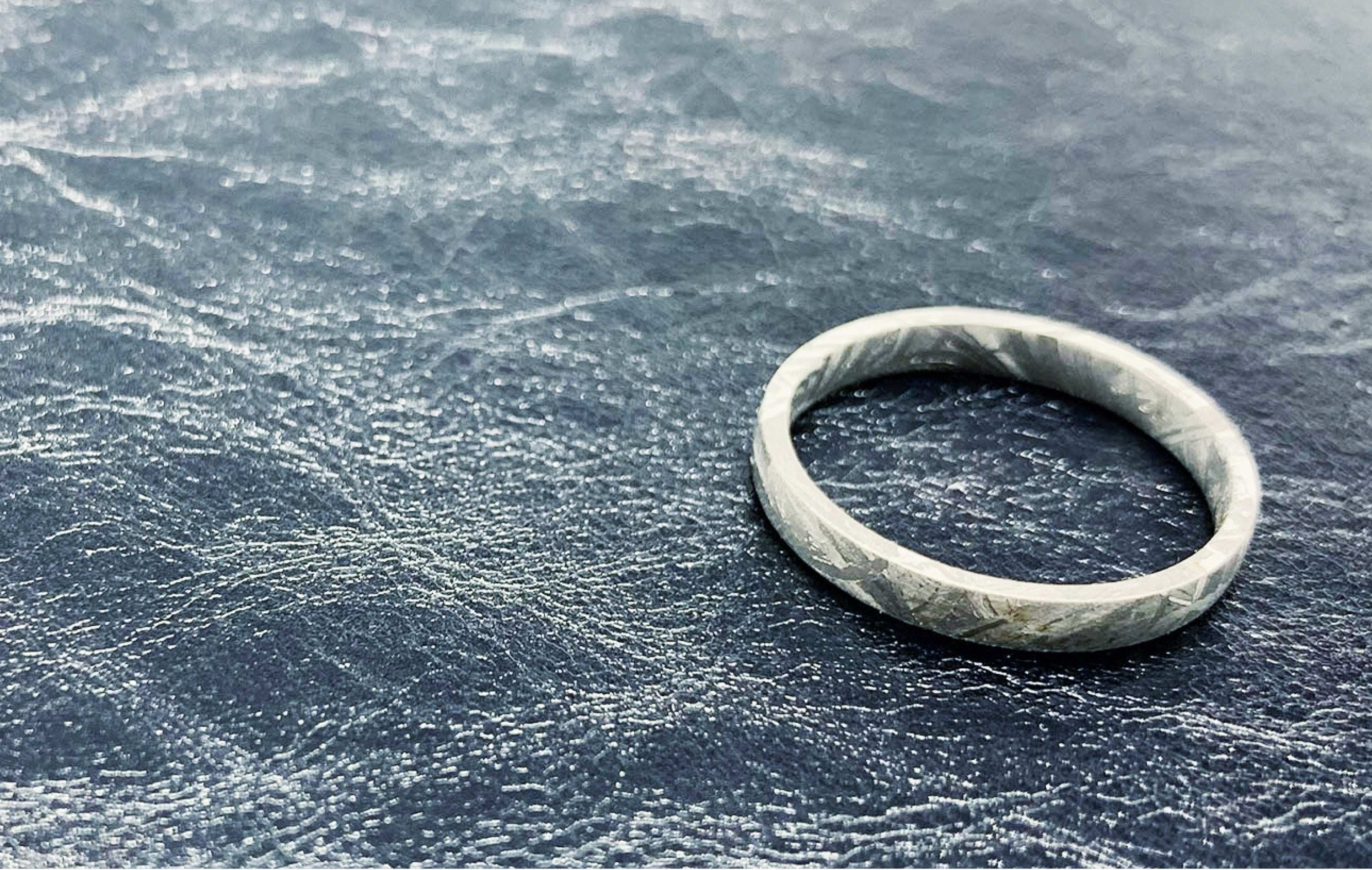 メテオライトリングには「ウィドマンシュテッテン構造」と呼ばれる、宇宙空間の特殊な環境下で何億年もかけて生成される美しい幾何学模様が見られます。