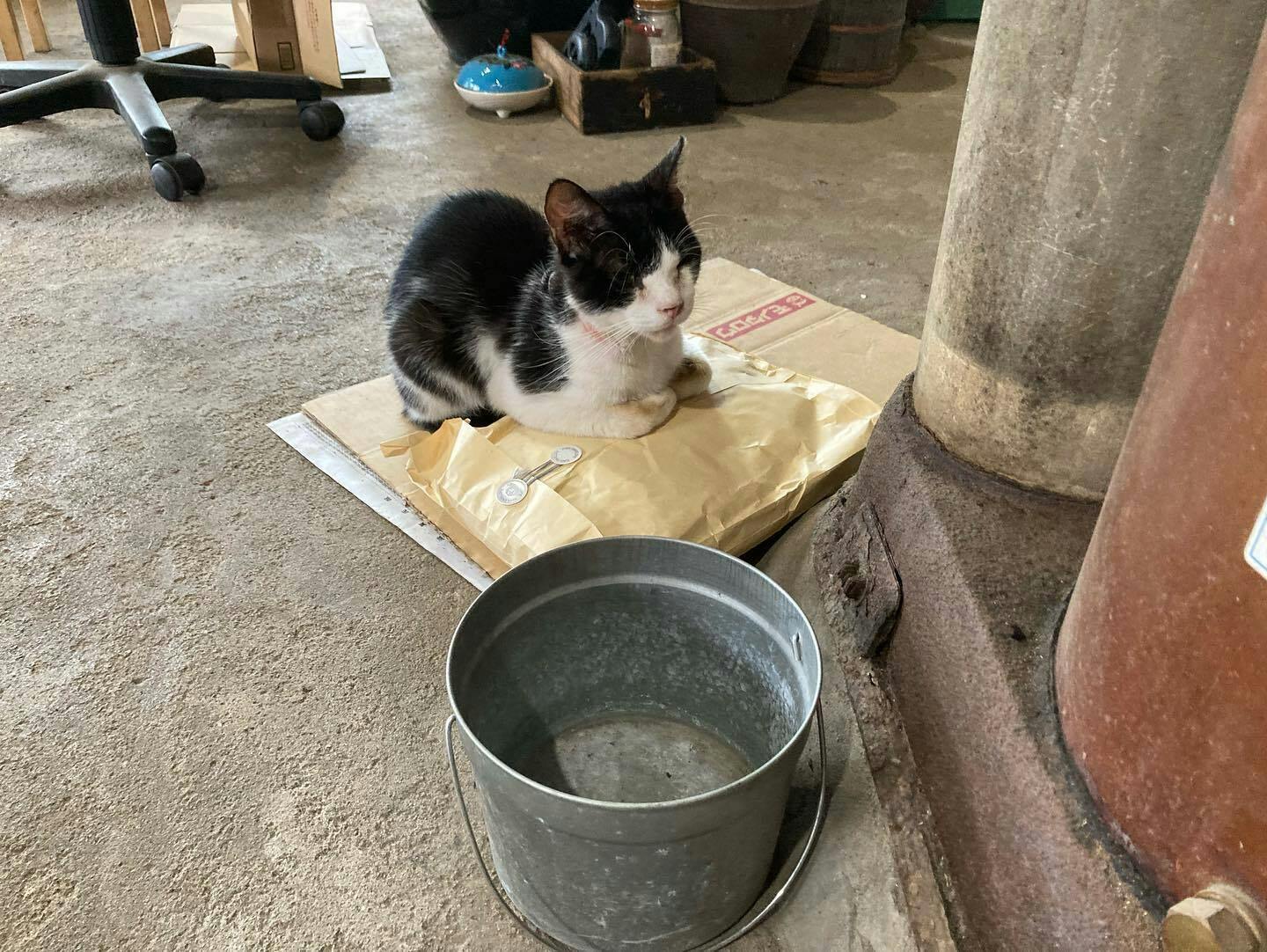 現在,迷い込んできた猫を保護しています。その猫が番をしているのは,今では珍しい風呂釜。細い薪や柴(枝)を上から入れて焚きます。薪や柴で火を焚くのは難しいと思われがちですが,この風呂釜は意外と簡単に火がついて、意外と少量の薪・柴で湯が沸きます。