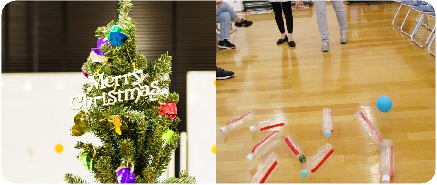 メンバーとスタッフ、ボランティアが交流を深めながら、風船バレー、椅子取りゲーム、ボウリングなどを行い、楽しく過ごしています。