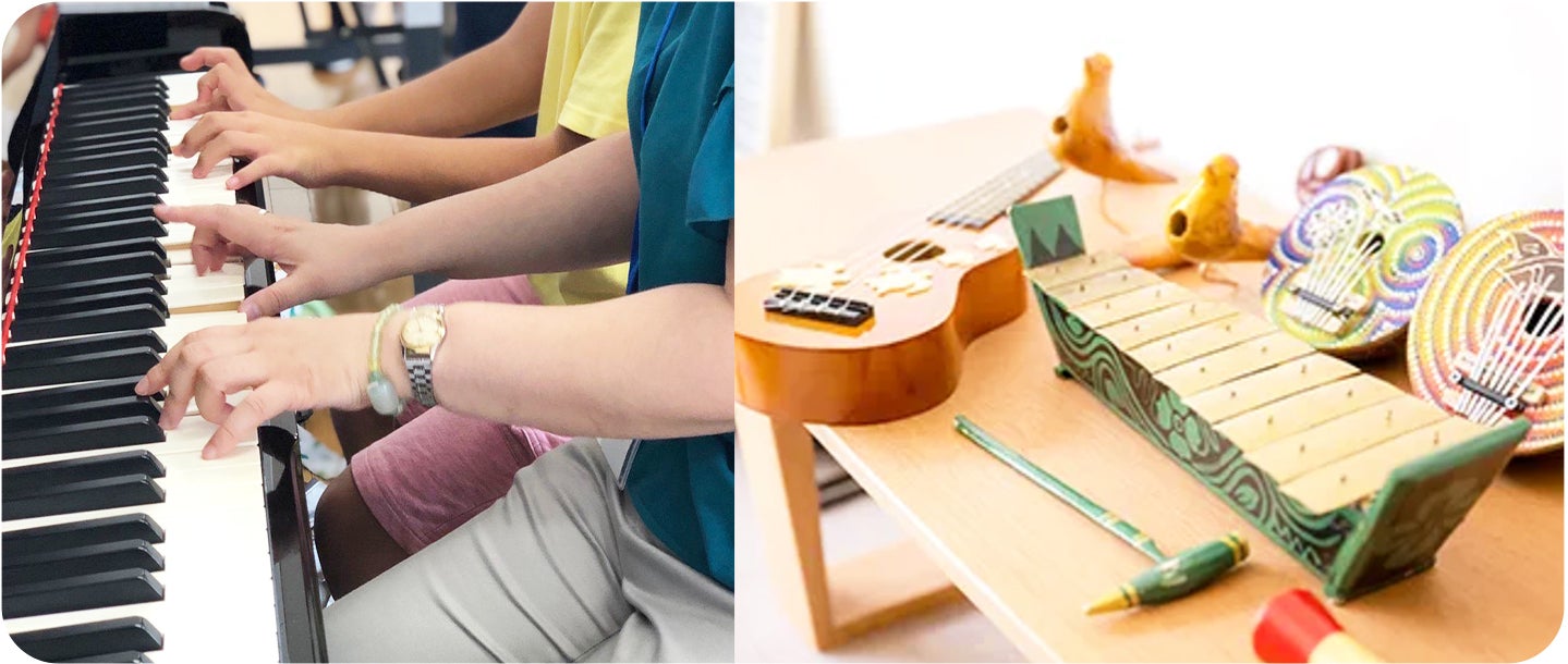 みんなで奏でる心地よさを体験することを目指して、歌・ハンドベル・民族楽器での即興演奏、ダンスなどを行っています。